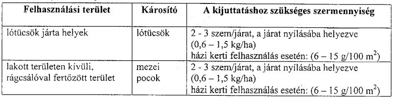 A csalétket a mezei pocok által lakott, vagyis a kezelést megelőző napon betaposott és következő nap a kártevő által kibontott lyukakba kell helyezni.